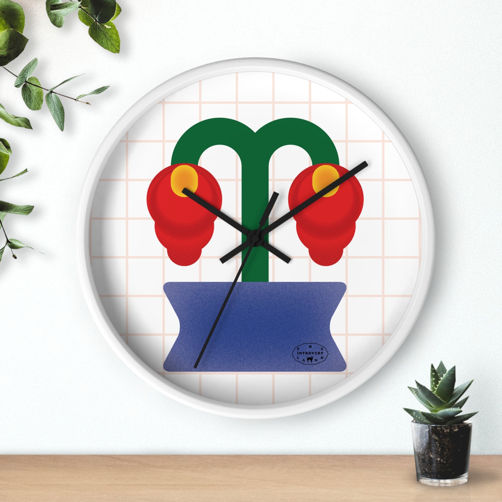 This wall clock features a stylized flamingo flower with curved green stems and vibrant red blooms, arranged in a sculptural, almost symmetrical composition. Set against a subtle grid and framed in clean white, the design feels playful yet balanced—adding character to a room without visual noise. The quiet clock mechanism keeps time gently, making it well suited for bedrooms, studios, kitchens, or calm workspaces.
