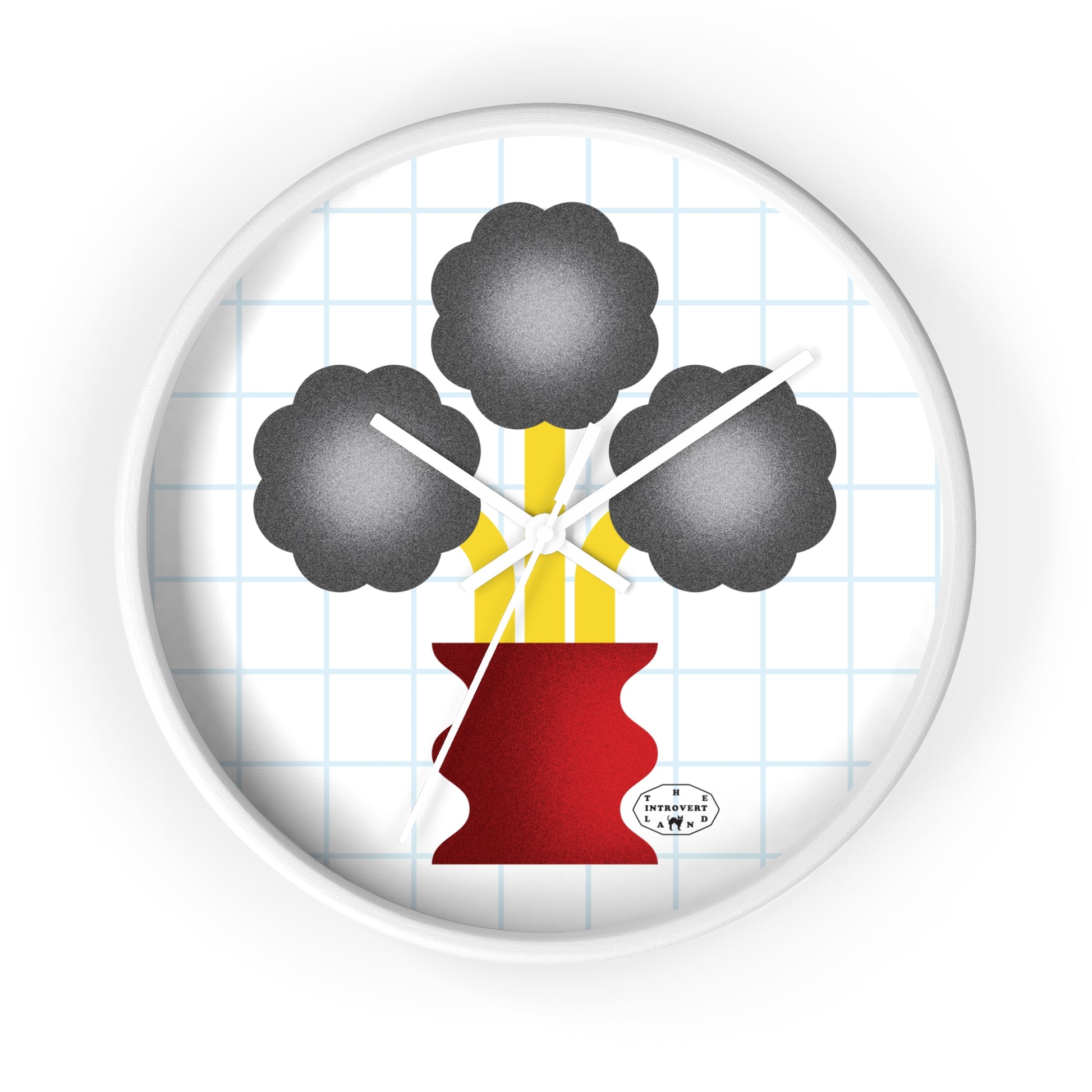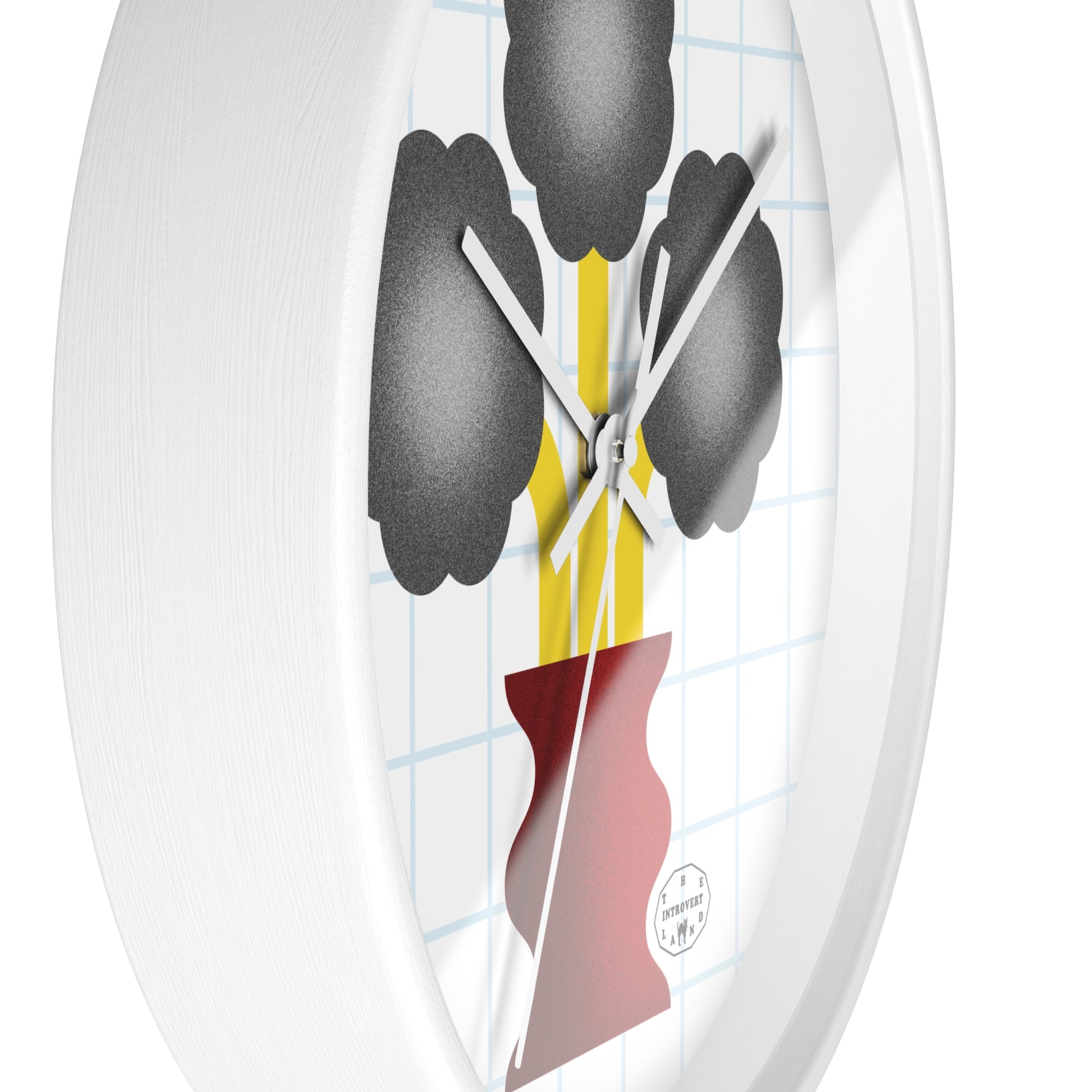 This wall clock showcases a stylized black jasmin bloom, with dark, rounded petals perched on delicate yellow stems in a striking red vase. The design sits against a subtle grid, blending modern lines with organic shapes. The clock’s white frame and simple hands create a minimalist yet eye‑catching focal point, perfect for kitchens, offices, or living spaces seeking a touch of unique floral art.