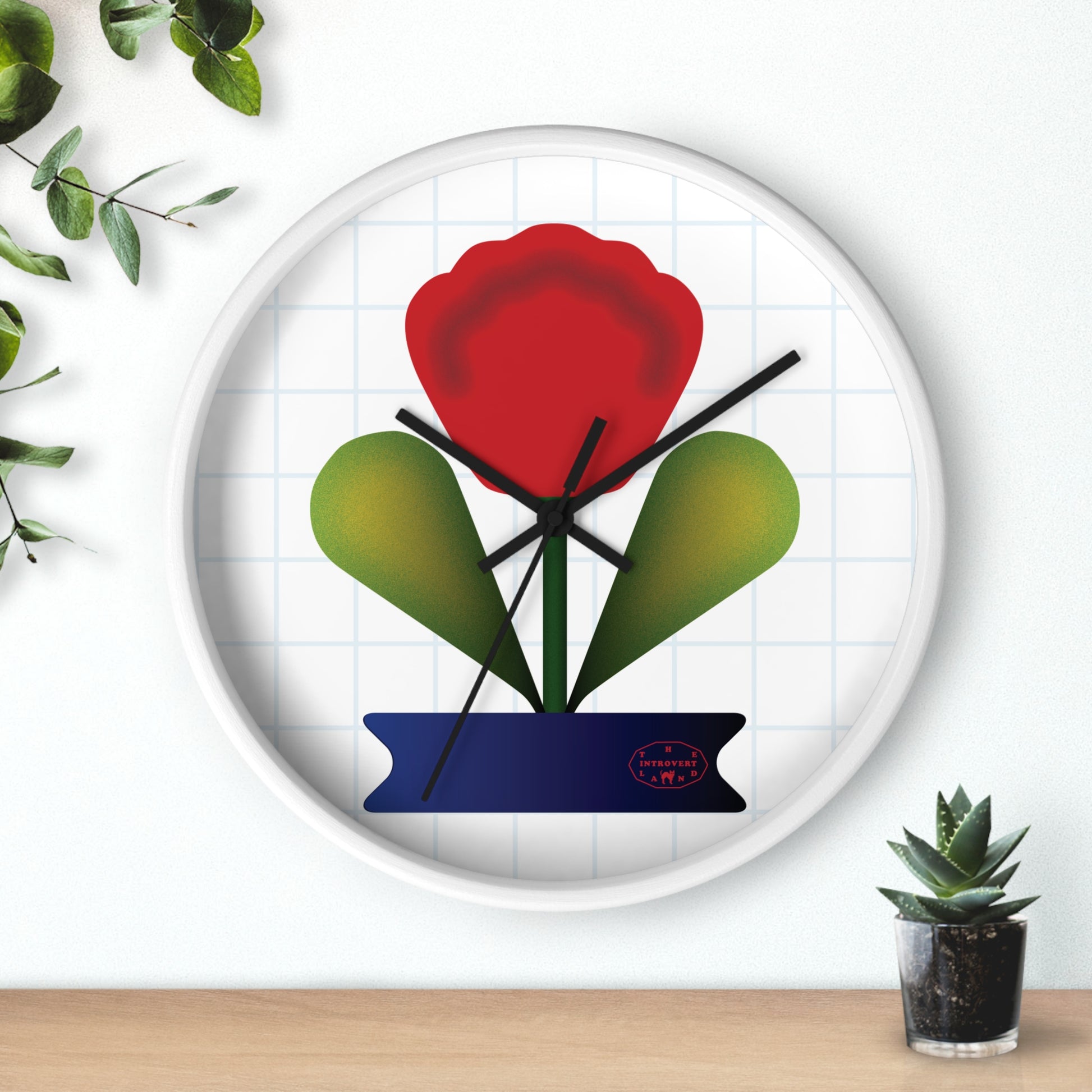 This wall clock features a stylized tulip bloom rising from soft green leaves, set against a subtle grid and framed in clean white. The bold red flower contrasts gently with the calm background, creating a warm focal point without overwhelming the space. Quiet and precise, the clock blends modern illustration with everyday functionality—ideal for bedrooms, workspaces, kitchens, or any room that benefits from a touch of calm color.